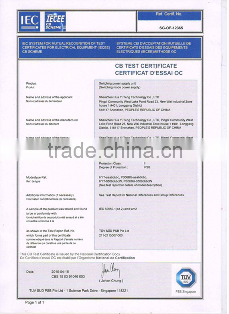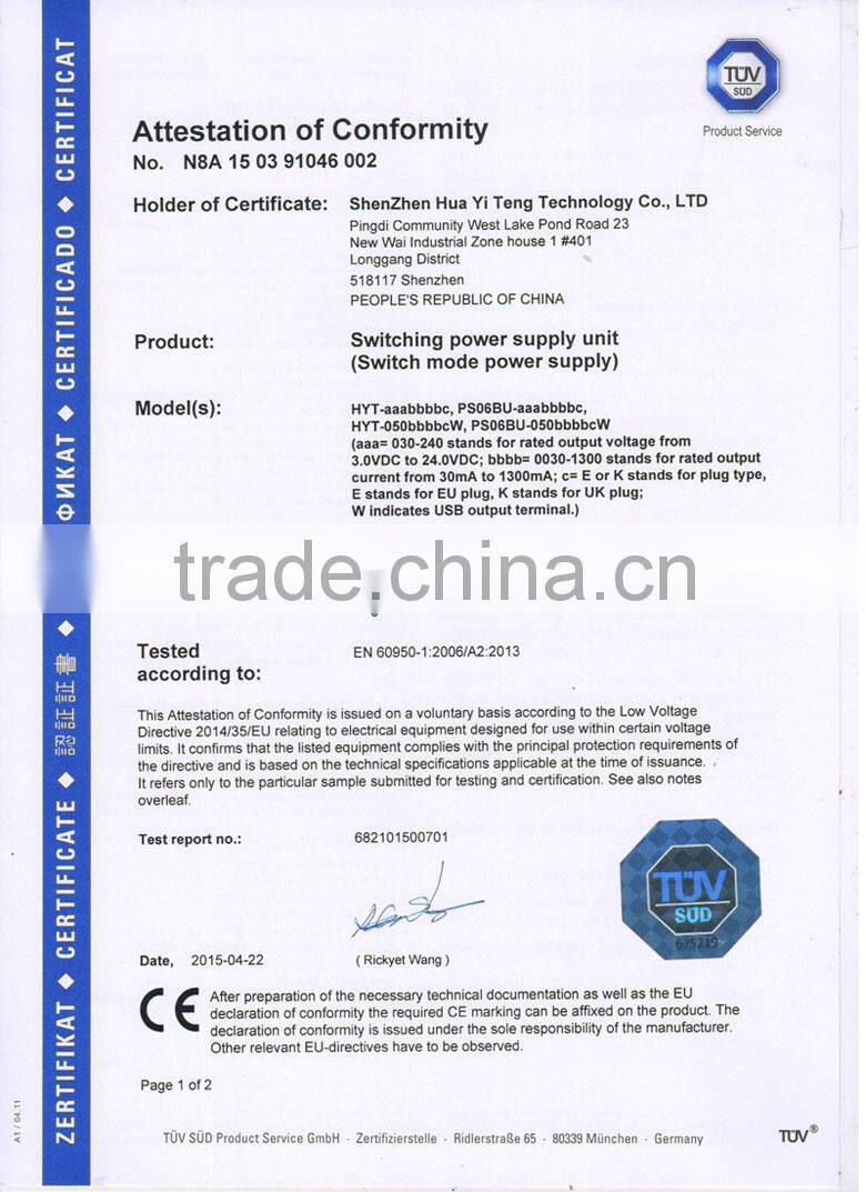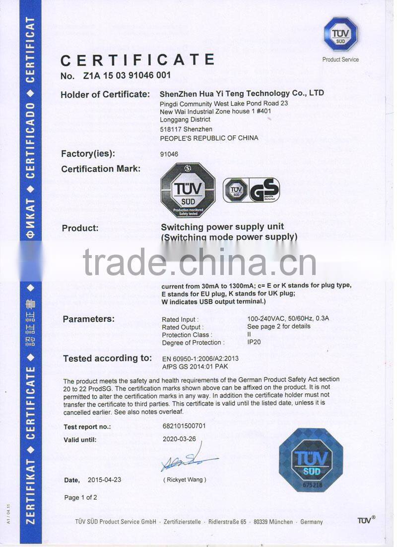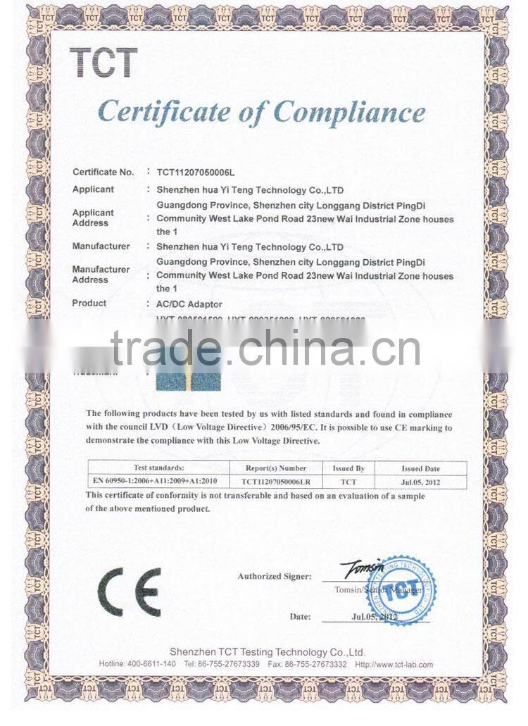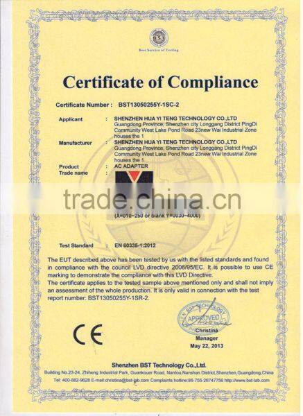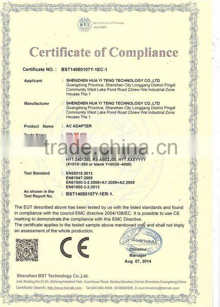 SHENZHEN HUA YI TENG TECHNOLOGY CO., LTD is an integrated high-tech enterprise which includes R&D, Production and sales. Our main products are Power Adapter, Charger, Water-proof Power Supply, Industrial Power Supply, which could be applied in the field of LCD, LCTV, Tablet PC, Communications, Portable Product, POS Terminal, Audio Equipment, Fan, LED Light, Security Product and kinds of Small Household Appliance, etc. It covers an area of three thousand square meters and we have more than one hundred trained, skilled worker and rich experienced R&D team to support you.